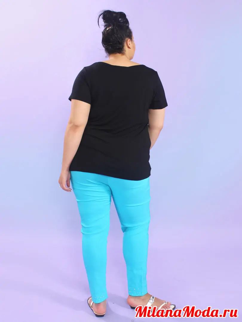 Летние брюки из хлопковой стрейчевой ткани(бенгалин). Фасон заужен, манжеты по низу изделия украшены стразами. Пояс - круговая резинка. Длина 102-105см. Состав ткани 60% хлопок, 35%полиэстер, 5% лайкра.